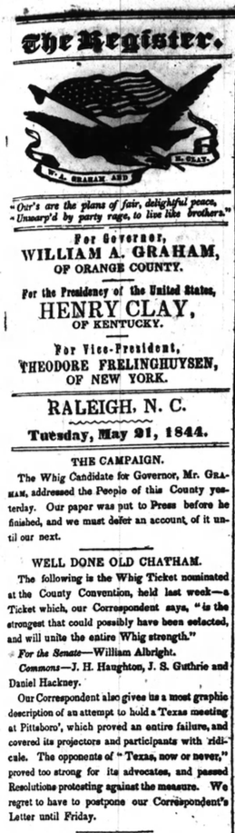 In 1844, when Hackney first ran for the House of Commons, his name appeared in various newspapers on a list of candidates for the Whig Party. Sometimes the announcement included candidates all the way up to Henry Clay for President of the United States. This example, from The Raleigh Register newspaper, included information about an important and hotly debated issue — possible annexation and statehood for the Republic of Texas.