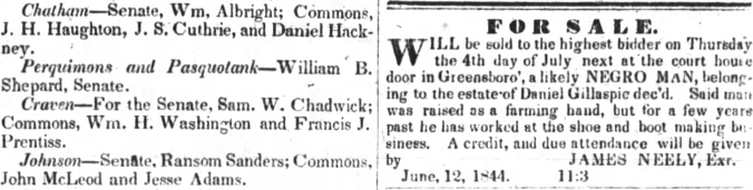 But the juxtaposition of his name and the “For Sale” notice to the right of the list of Whig candidates below in The Greensboro Patriot newspaper is an unsettling visual reminder of what life was really like in North Carolina in 1844. While I can’t change the past, in the spirit of George M. Horton’s sermonic essay, my prayer today is that my individual influence, by God’s mercy and grace, will not be “opposit to divine.”