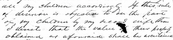 From the bottom of the first page of Royal George Williamson’s will: “If this rule of division is objected to on the part of my children by my second wife then I direct that the value of their property obtained as aforesaid shall be ascertained [and they shall receive an equal share of my estate less that value].”